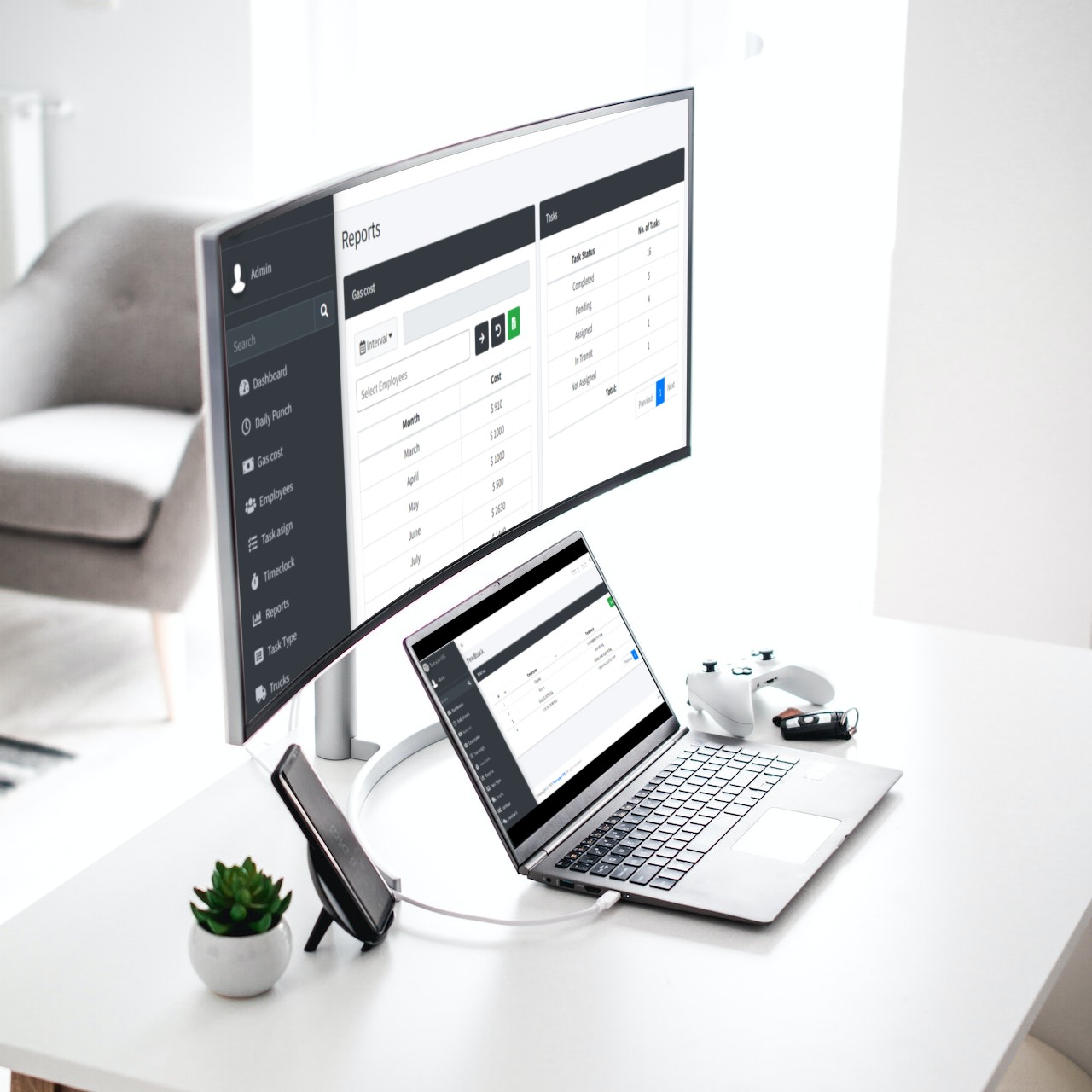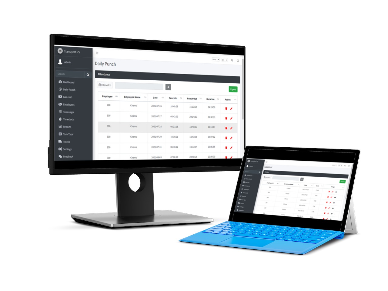 Admin can Manage all time clock and show what task is pending, status , employee punch in and punch out details